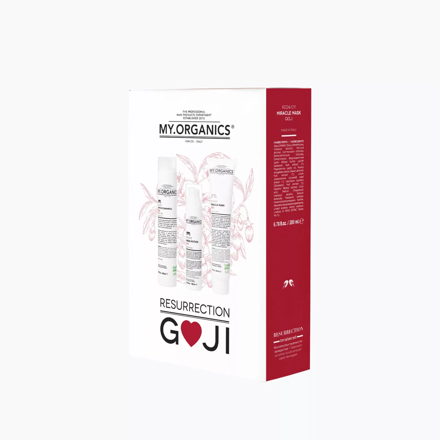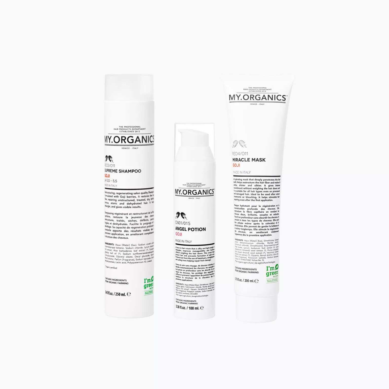 Marka MY.ORGANICS — włoska marka z certyfikatem ICEA i COSMOS ORGANIC. Składniki z kontrolowanych upraw ekologicznych. Pojemność: 250ml + 200ml + 100ml.